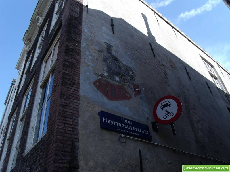 Dordrecht • Wijnstraat 1 t/m 117 • Gevelschildering vermoedelijk ter herinnering aan de lijndienst van de voormalige Rotterdamsche Tramweg Maatschappij die ook zijn dienst had in Dordrecht. Foto genomen op 05-09-2011. • Zomer 2011